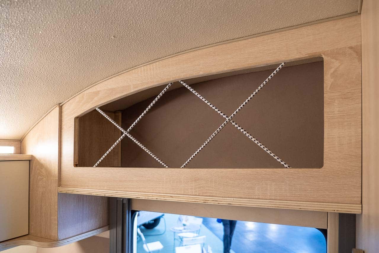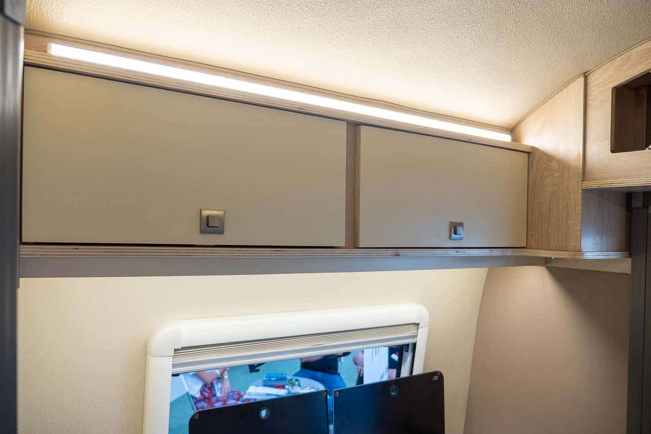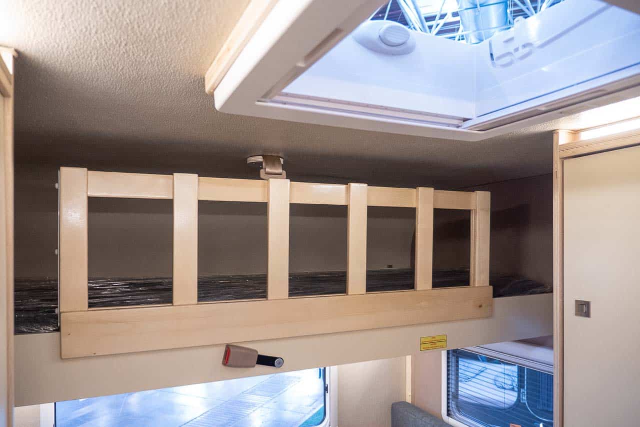 Het stapelbed boven de zithoek kan ook als optie worden gebruikt, zodat er maximaal drie personen in de minicaravan kunnen slapen.