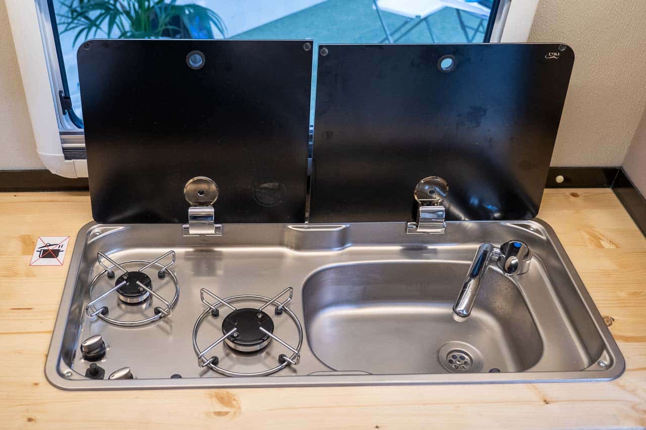 Er is ook een zeepbakje bij de wastafel. De minicaravan heeft een schoonwatertank met een inhoud van 100 liter water.