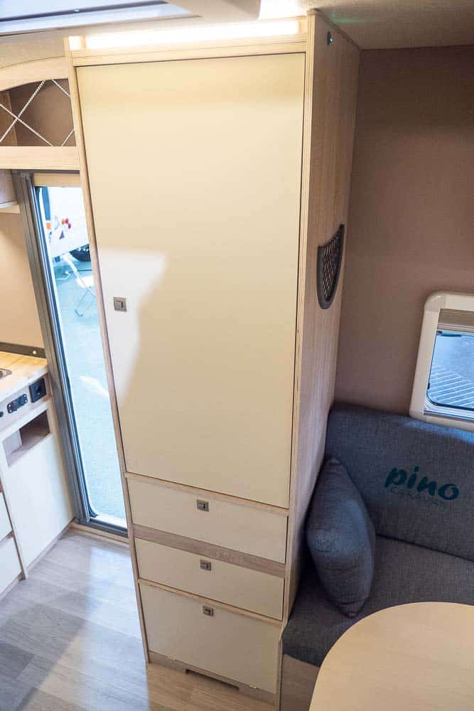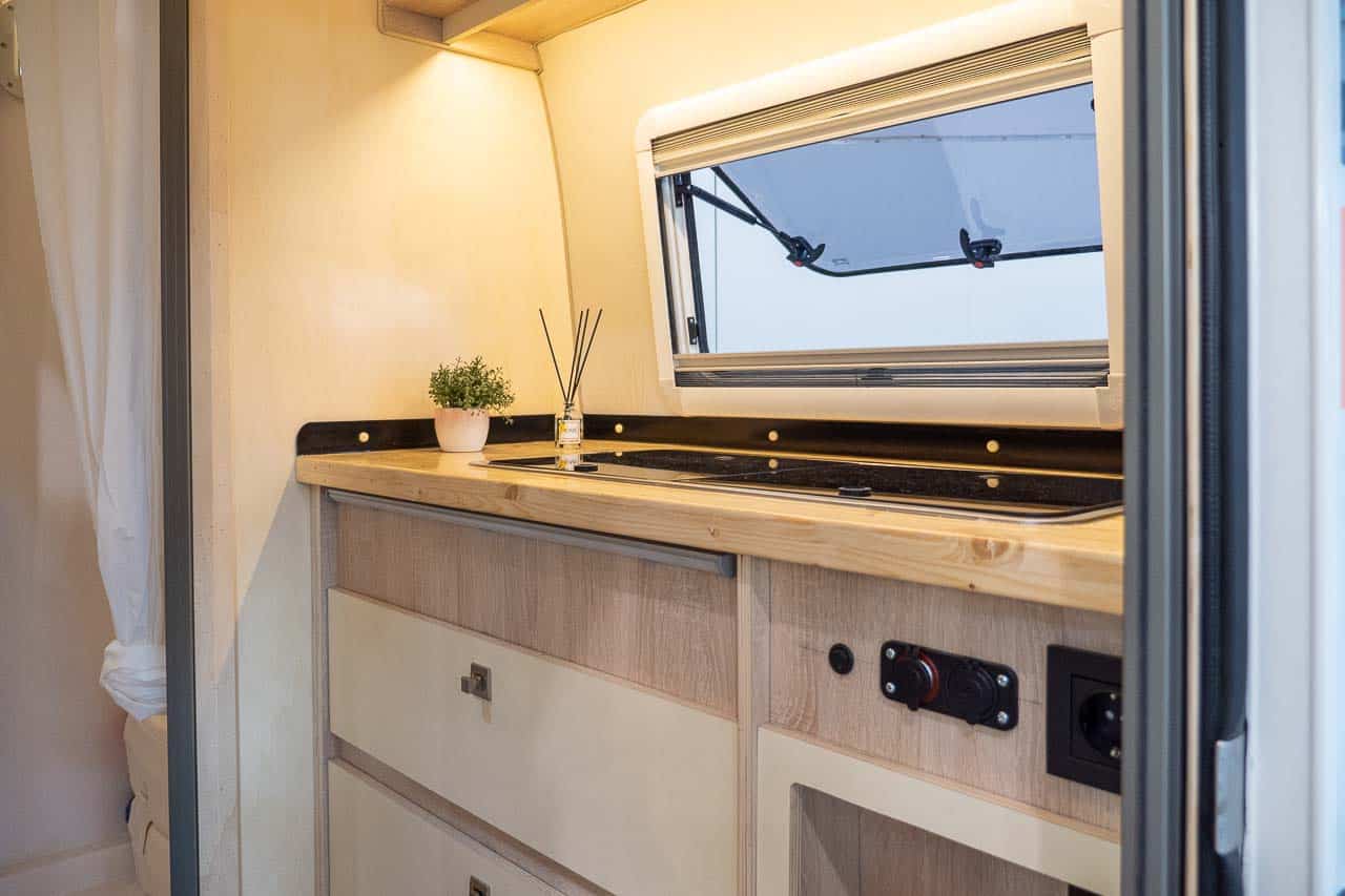 De Pi XL van PinoCaravan is zo’n minicaravan. De keuken, badkamer en een zithoek, die kan worden omgebouwd tot het hoofdbed, zijn ondergebracht in een minimale ruimte.