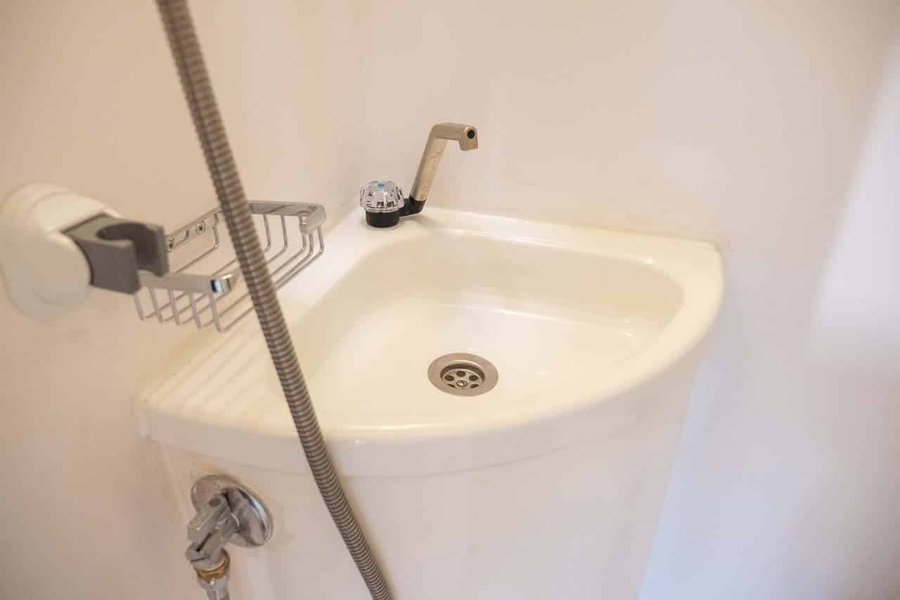 De natte cel bestaat uit een draagbaar cassettetoilet, een wastafel en een douche. Het toilet is verwijderd uit de kleine badkamer om te douchen.